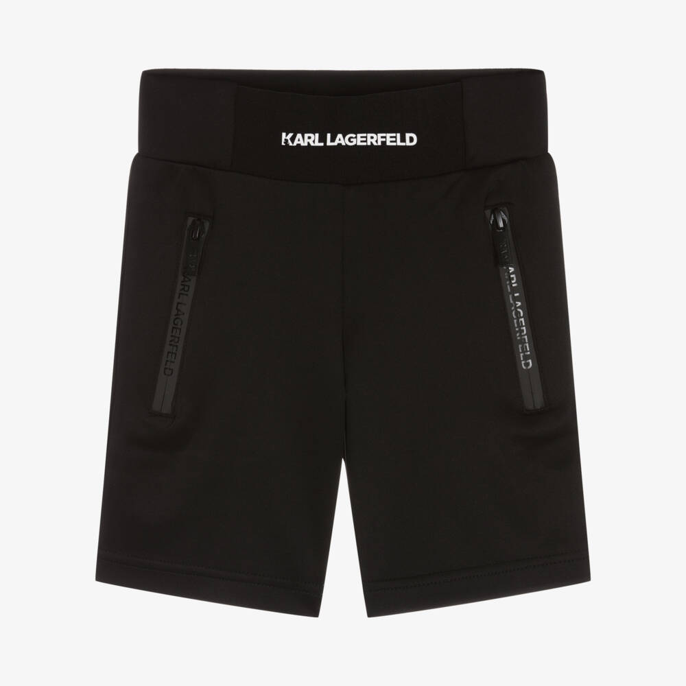 Black jersey shorts for boys by KARL LAGERFELD KIDS. This pull-on style has a bold white logo printed on the front panel of the elasticated waistband. Silky smooth and stretchy, they have logo-taped zip fastening on the front pockets with branded zip pulls for a sleek sporty look.