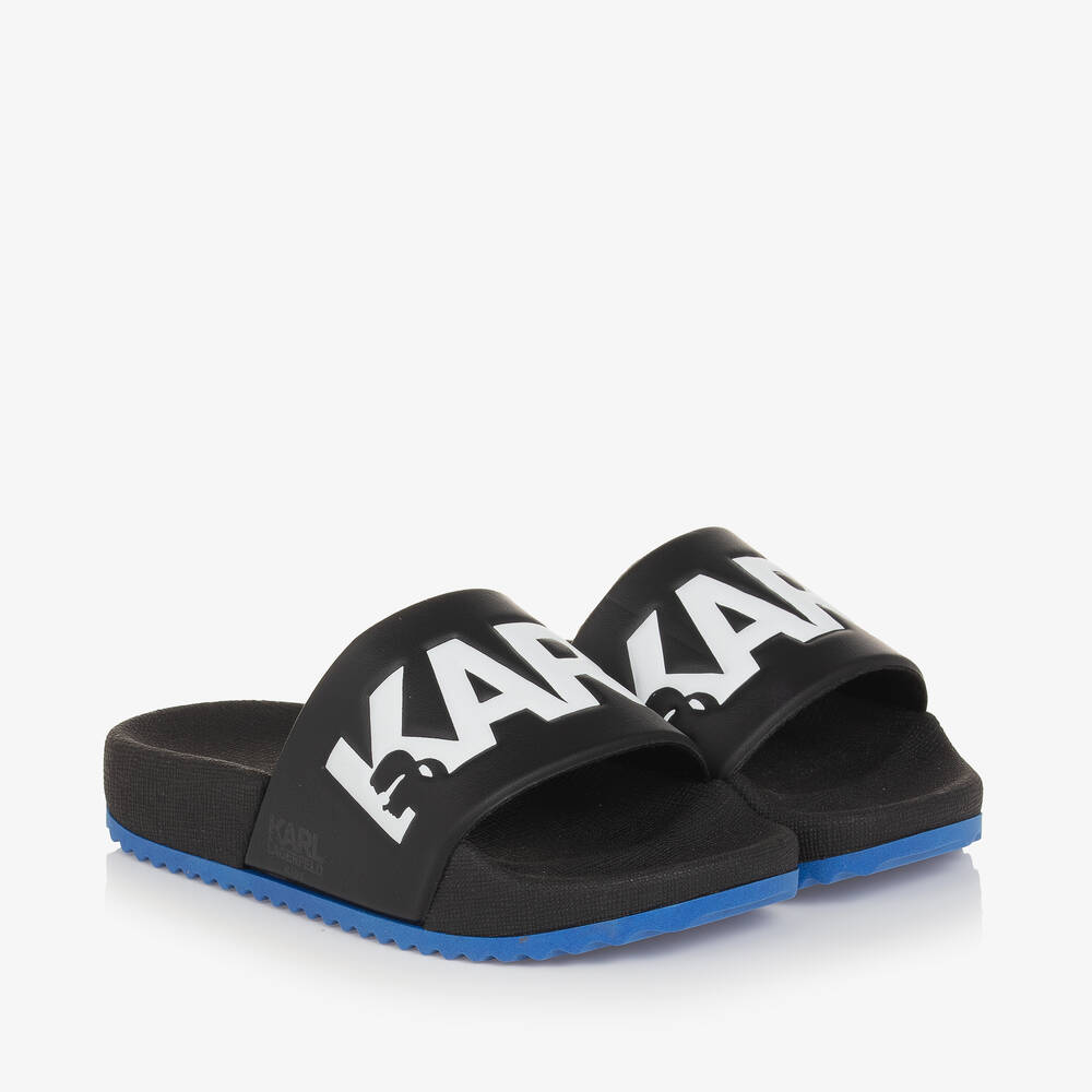 Cool black sliders for boys by KARL LAGERFELD KIDS, as seen in the main collection. A distinctive designer poolside look, they have a bold white KARL print with the signature Karl Kameo on one side. The footbed is moulded for comfort and they have a contrast bright blue sole, ridged for improved grip.