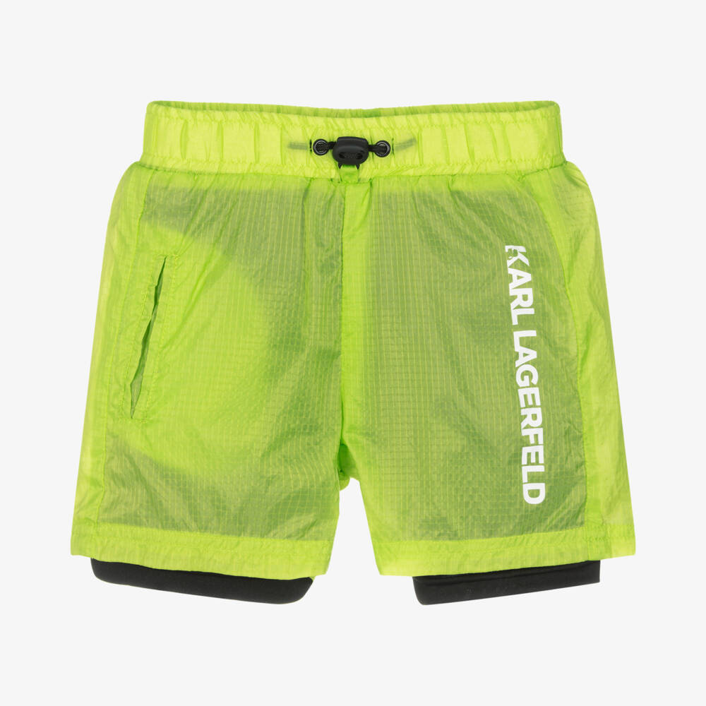 Sporty bright lime green shorts for boys by KARL LAGERFELD KIDS, with a bold white logo print on one leg. This layered style has a super lightweight, water-repellent coated ripstop nylon outer layer and more fitted black jersey inner shorts. There is a pocket on the front and a black, faux drawstring toggle on the elasticated waistband.