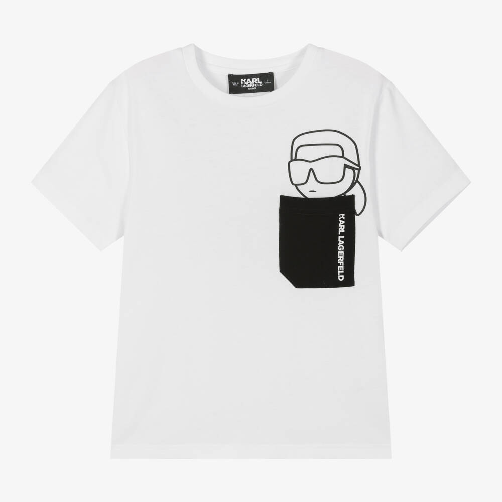 White Mini-me T-shirt for boys by KARL LAGERFELD KIDS, made in soft cotton jersey. This casual tee has a contrast black pocket on the chest with a Karl Ikonik graphic print.