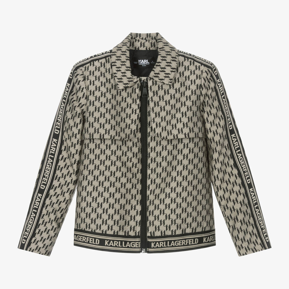 Cool beige jacket for girls by KARL LAGERFELD KIDS, patterned with the brand's KL monogram in black. Made in soft twill, it has stylish panels overlaid on the front and back, with jacquard logo taping along the sleeves and waistband. It is lined in jacquard logo satin for comfort and fastens with an exposed, black zip on the front.