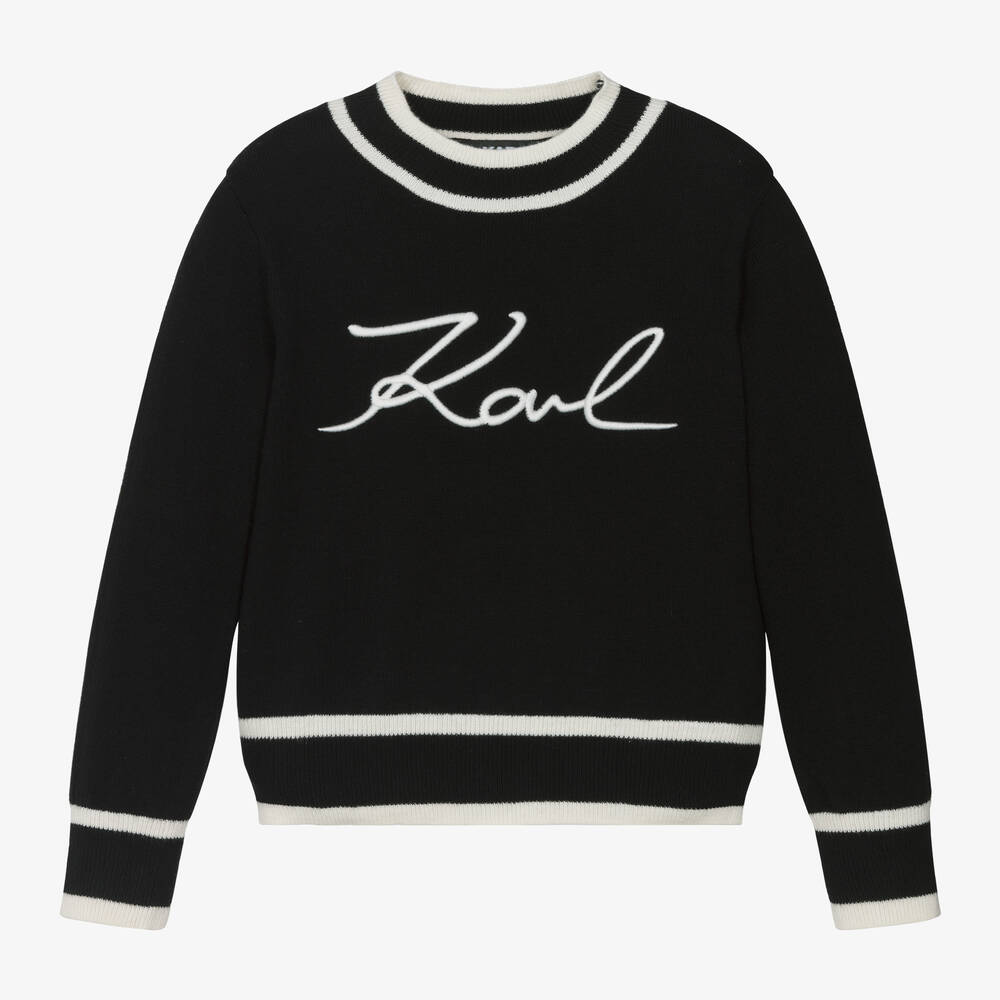 Mini-me black sweater for girls by KARL LAGERFELD KIDS, made in a beautifully soft cotton knit, with a touch of luxurious cashmere. Instantly recognisable, a bold Karl Signature logo is embroidered in ivory on the front of this stylish top. It has cosy ribbed trims and a high neckline detailed with ivory stripes for a coordinated finish.