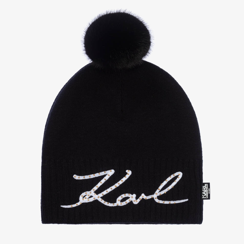 A cool black beanie hat for girls by KARL LAGERFELD KIDS, with a fluffy faux fur pom-pom on the top. It is made in a double-layer cotton knit with a touch of cashmere for added softness. The ribbed brim has an eye-catching Karl Signature logo embroidered in white with golden studs on the front and a rubberised branded patch on the side.
