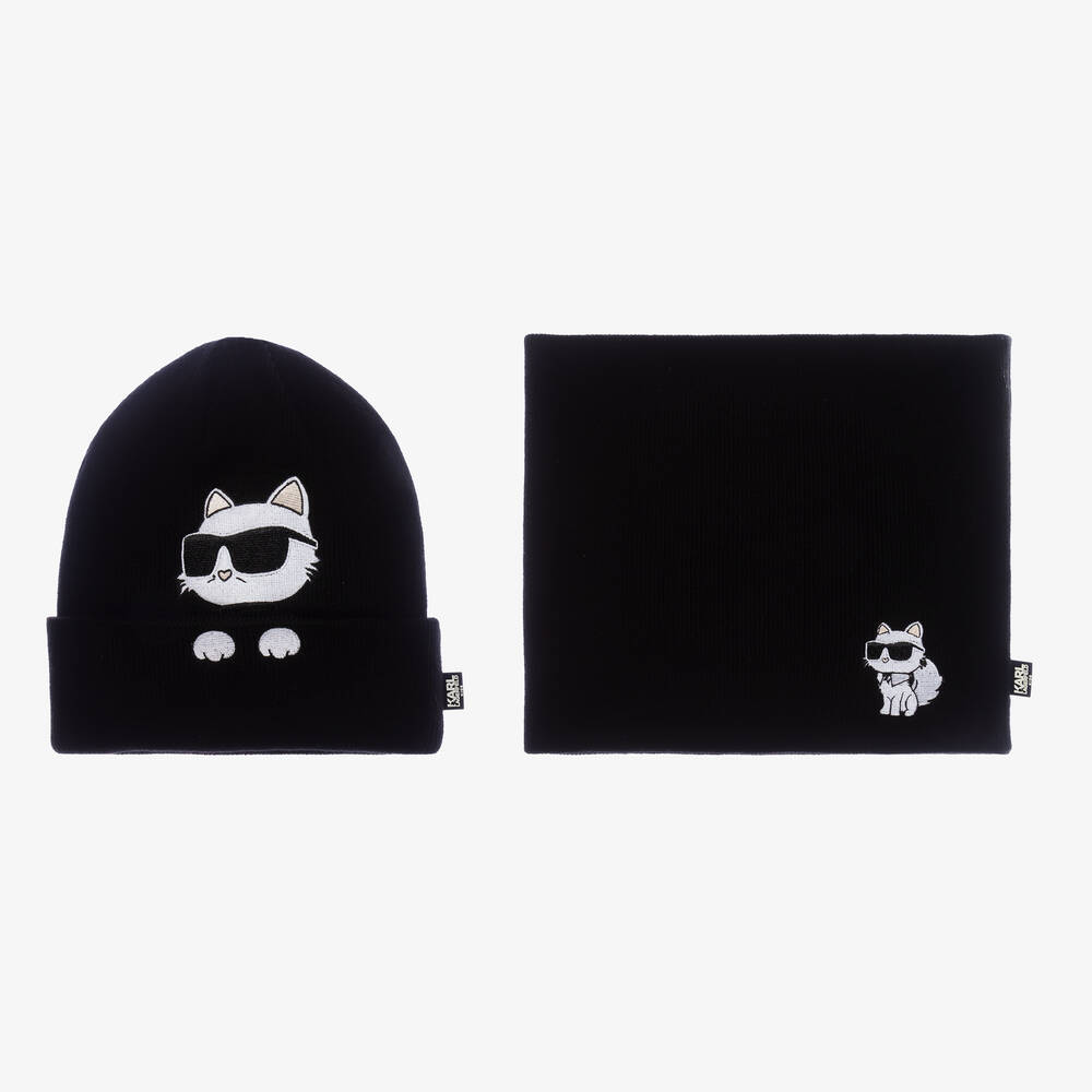 Cute and cosy, this black beanie hat and snood set for girls by KARL LAGERFELD KIDS is made in two layers of soft cotton knit. Both pieces are embroidered with the designer's beloved Choupette for a coordinating look, with a black and white rubberised logo patch stitched on the side.