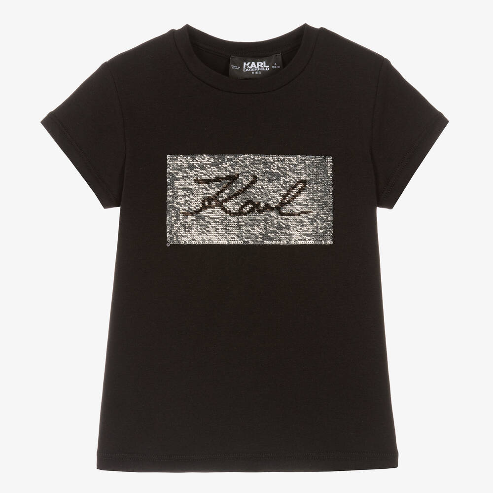 An eye-catching black short-sleeved T-shirt for girls by KARL LAGERFELD KIDS. Made from soft organic cotton-blend jersey, it has the iconic Karl Signature logo on the chest formed out of reversible black, gold and silver sequins for a fun and sparkly look.