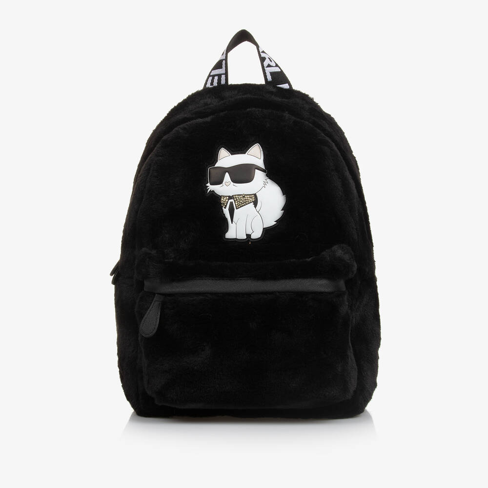 Black backpack for girls from KARL LAGERFELD KIDS, super fun in fluffy faux fur. Trimmed with faux leather, this cute design is enhanced by the adorable Choupette cat motif on the front, with diamanté detailing. It has a main compartment and front pocket, both fastening with zips and lined in silky jacquard fabric. The back is lightly padded for comfort and the adjustable straps are signed with white interwoven branding for a statement look.