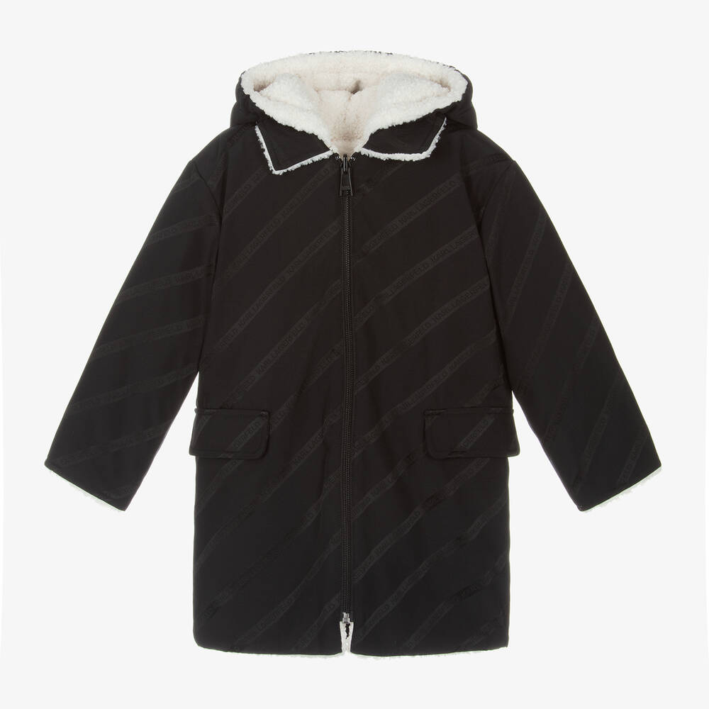 A black and ivory reversible hooded coat for girls by KARL LAGERFELD KIDS. Both practical and cosy, there are tonal branded stripes on the smooth black fabric, whilst the reverse is made in ivory sherpa fleece, with a Karl Ikonik black logo patch on the chest. There are useful pockets on both sides and a branded black zip fastening on the front.