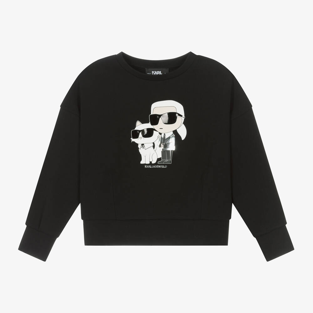 Black, long-sleeved sweatshirt for girls by KARL LAGERFELD KIDS. It has the distinctive Karl Ikonik artwork printed on the front for a bold designer statement, featuring Karl and his cat Choupette. With shiny silver detailing and a white logo around the back, it is made in soft, comfortable jersey, in a relaxed drop-shouldered style.