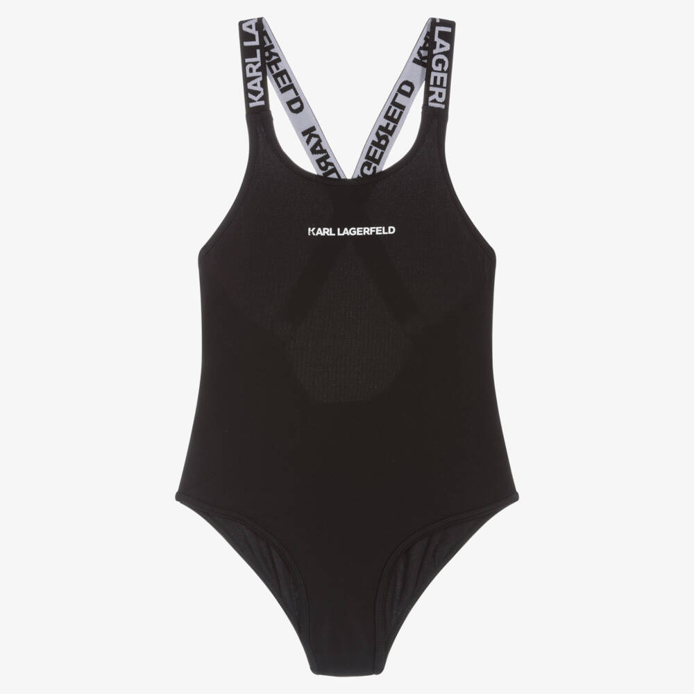Timelessly stylish black swimsuit for girls by KARL LAGERFELD KIDS. Silky smooth and stretchy, this comfortable swimsuit has a white logo print on the chest and adjustable jacquard logo cross-over straps for a sporty finish.