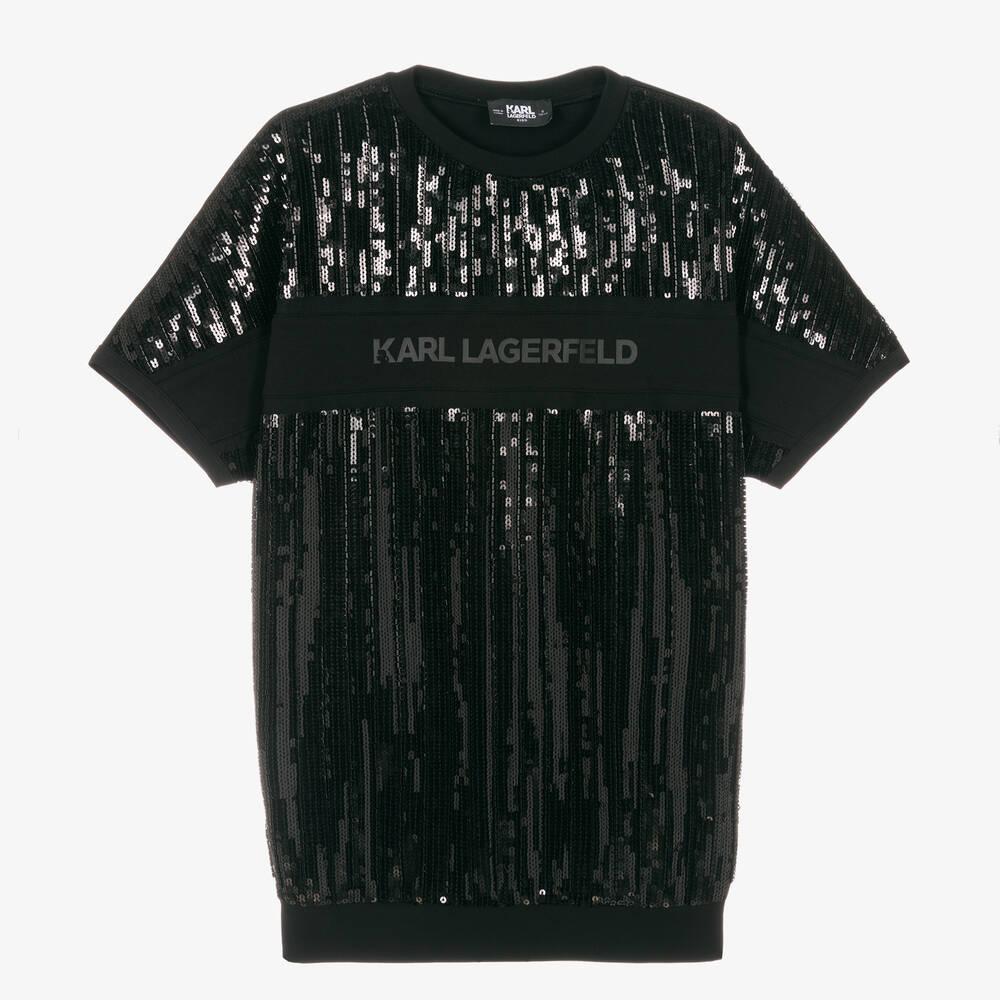 A relaxed black T-shirt style dress for girls by KARL LAGERFELD KIDS, with seamless short sleeves. In casual and laid-back silhouette, it is stitched with shiny black sequins and beads on the front for an eye-catching finish. Made from soft cotton jersey, it has a panel across the chest with subtle mesh trims and a tonal logo printed on the front for a branded finish.