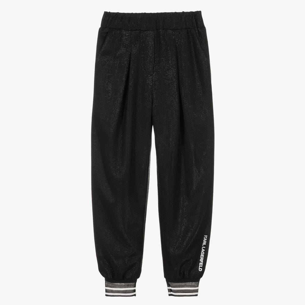 Ideal for a sports luxe style, these black joggers for girls are by KARL LAGERFELD KIDS. Smooth and sparkly, they have pleated details on the front and ivory and black striped mesh trims on the cuffs. Complete with slanted pockets, they have a lightweight viscose lining and an elasticated waist for a comfortable fit.