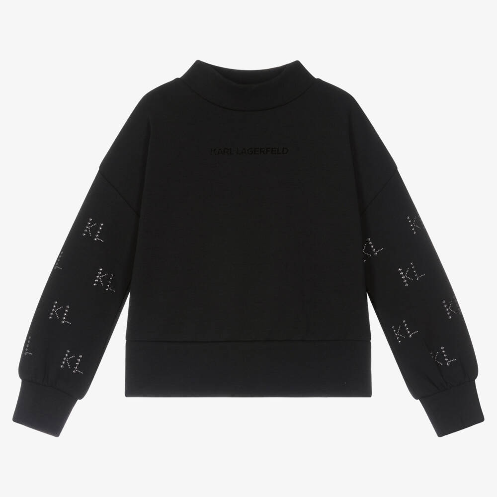 Black mock neck sweatshirt for girls by KARL LAGERFELD KIDS, made in a soft and stretchy cotton blend jersey. It is designed in a cool, boxy fit with dropped shoulders and stretchy ribbed cuffs and hem. For designer appeal, it has a shiny black logo on both the front and back, with the designer's initials patterning the sleeves in silver-tone studs for a cool, modern finish.