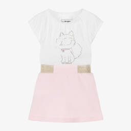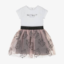 Cute black and white skirt set for little girls by KARL LAGERFELD KIDS. The cotton jersey T-shirt has a ribbed collar, branded button fastenings and neat pleats on the front. It features a rubberised Choupette on the chest for instant brand recognition. The glittery skirt is fully lined and has a ribbed, elasticated waist for a comfortable fit.