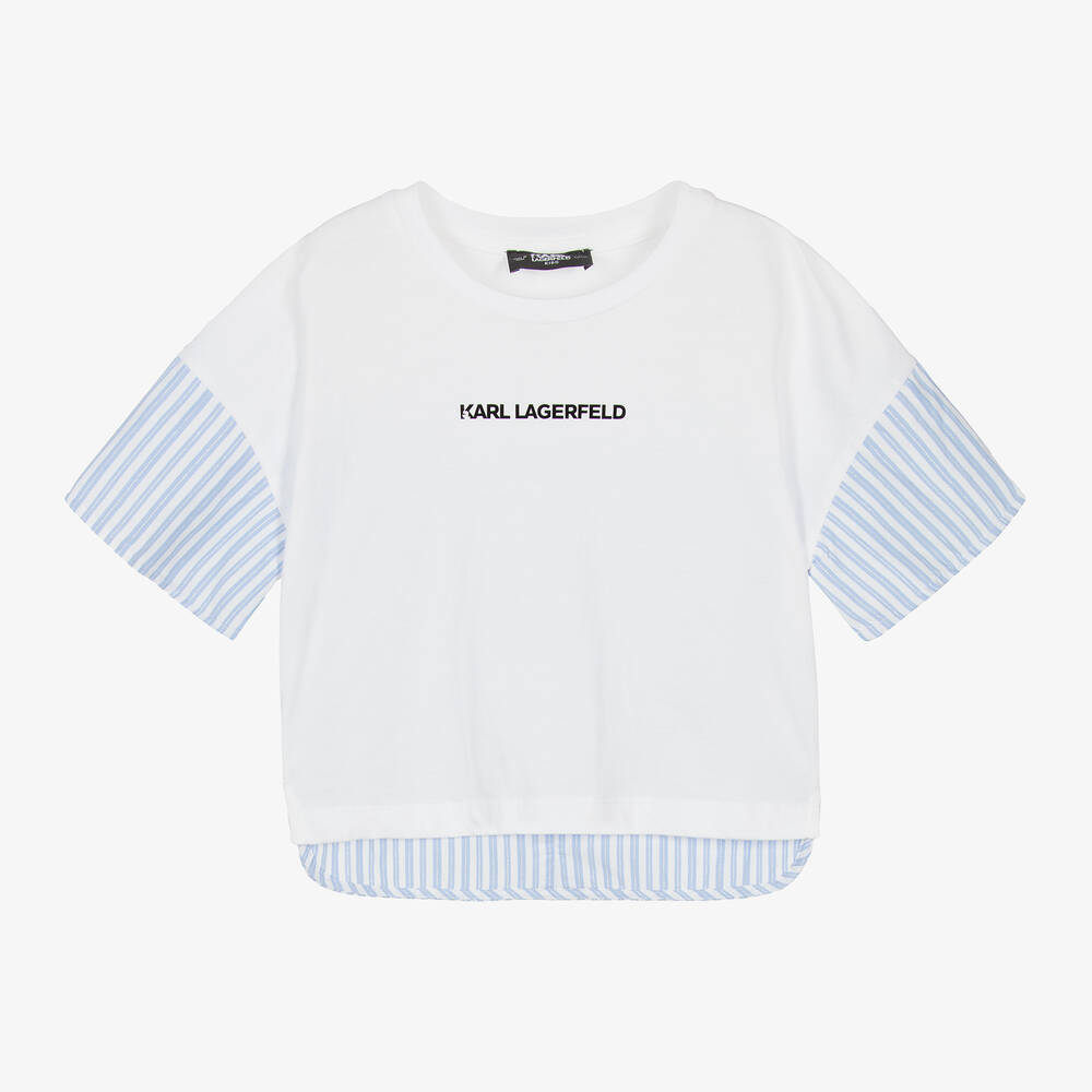 Blue and white Mini-me T-shirt for girls by KARL LAGERFELD KIDS, made in soft cotton jersey and lightweight poplin. On the front is a shiny logo print for a branded look. The striped back has a longer length hem and is woven with fine metallic thread in a silver tone. Faux buttons on the back add neat, decorative detail.
