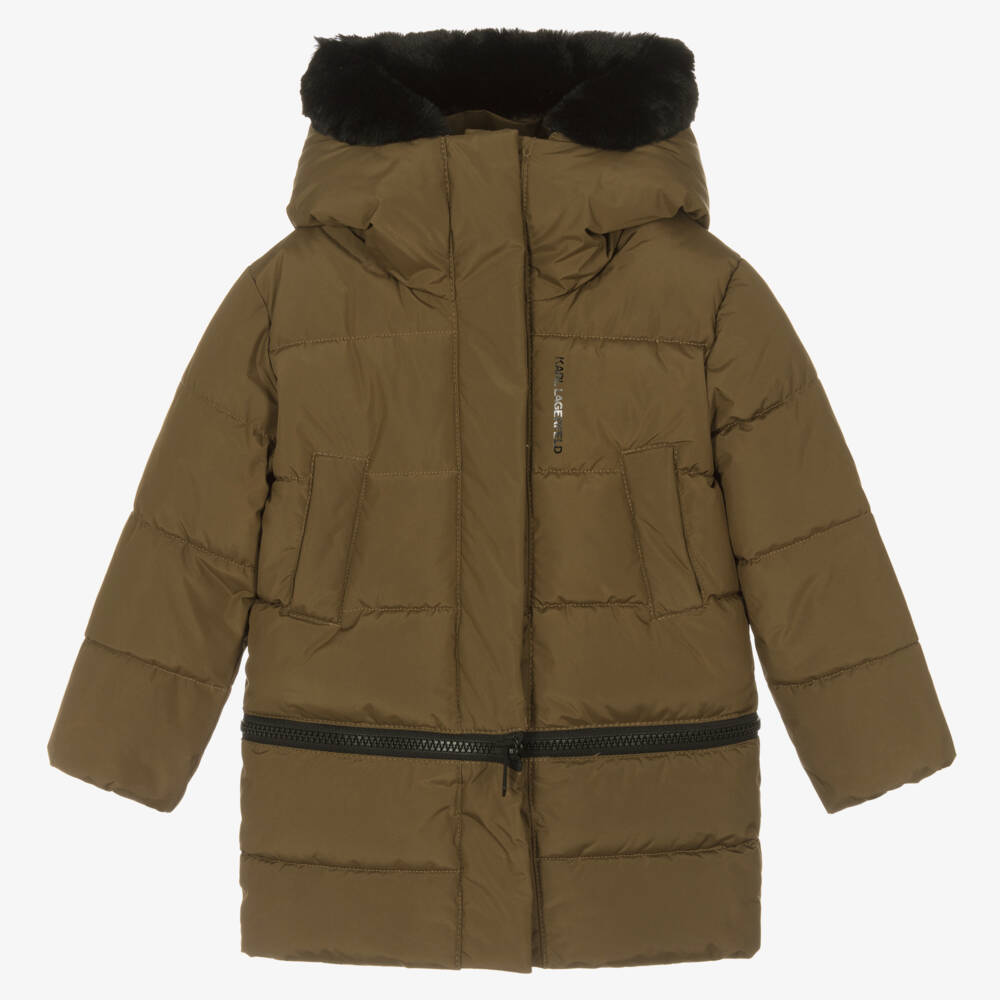 Khaki green hooded puffer coat for girls by KARL LAGERFELD KIDS, providing multiple stylish looks. Made in silky recycled fabric, it is padded for warmth and has a silky black lining with a tonal Karl Kameo jacquard pattern. Fastening with concealed poppers, it has detachable black faux fur trim on the hood and a detachable bottom panel secured with a zip, to create a jacket. There are hand-warmer chest pockets and black logo prints on the front and back adding a designer finishing touch.