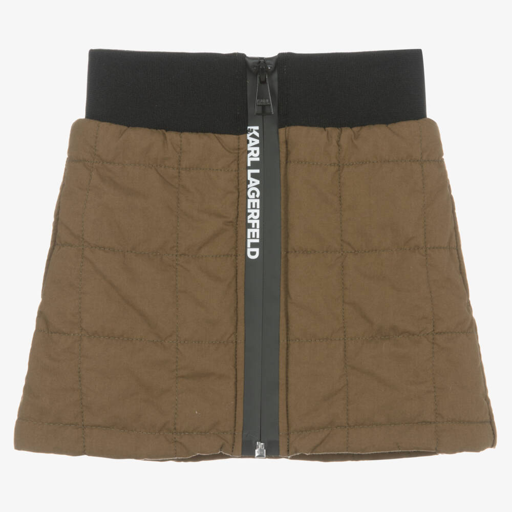 Quilted khaki green skirt for girls by KARL LAGERFELD KIDS. This cotton skirt is lightly padded and has a comfortable soft viscose lining. For a casual finish, it is styled with a stretchy ribbed waistband and has a black taped zip fastening on the front with a white logo print. The pockets are concealed on the side seam for a neat finish.