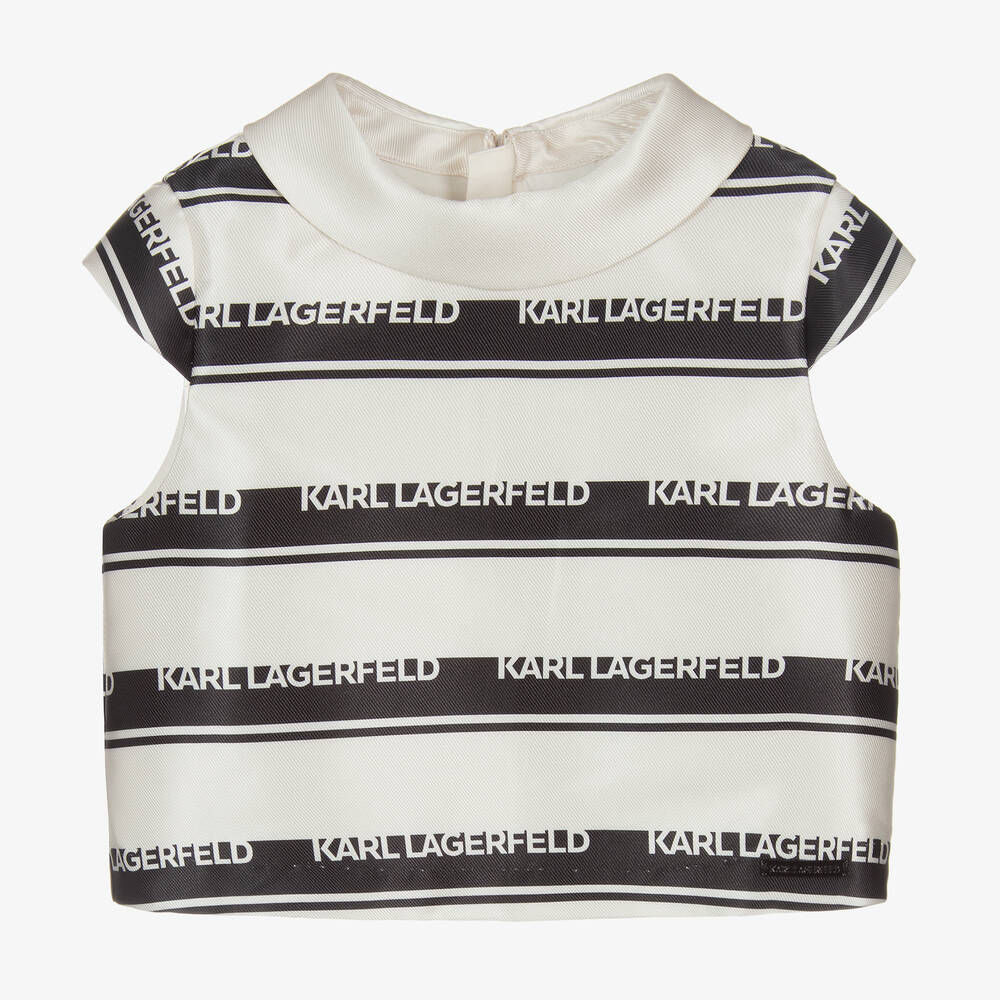 Lovely ivory and black striped blouse for girls by KARL LAGERFELD KIDS, made in smooth satin twill. Stylish and elegant, with a gentle A-line shape, it features a black all-over logo design and a discreet black logo plate by the front hem. Fully lined for comfort, it has a neat collar and fastens with a concealed zip on the back.