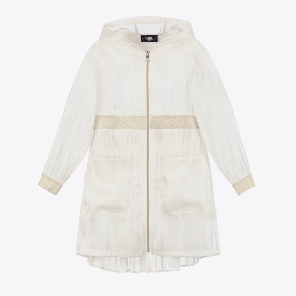 Ivory hooded coat for girls by KARL LAGERFELD KIDS, made in semi-sheer satin with a gorgeous pearlescent shimmer. Soft against the skin, the delicate fabric is beautifully lightweight and pleated on the back for added movement. The gold tape waistband, woven with jacquard lettering, adds glittery detailing to the coat. A gold zip and the two front pockets complete this longer length style.