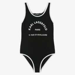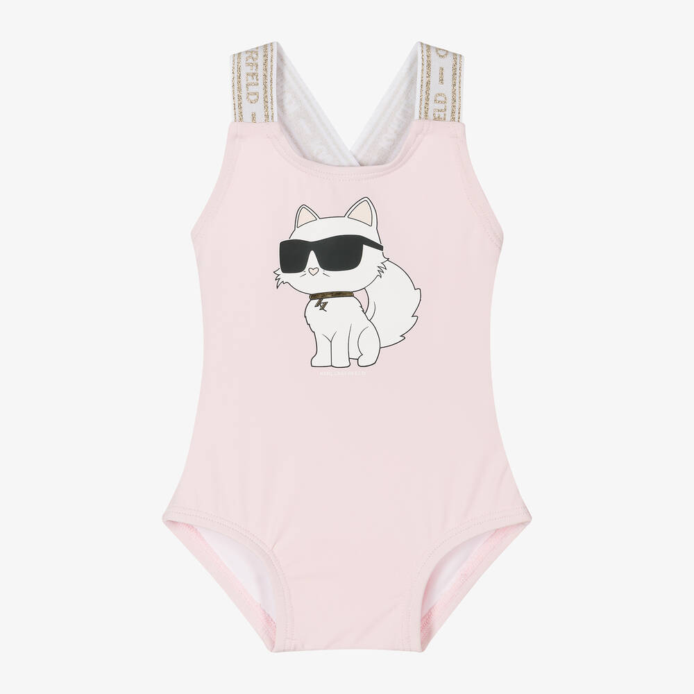 Cute pink swimsuit for little girls by KARL LAGERFELD KIDS, with Karl's beloved cat Choupette printed on the front. Silky smooth and stretchy, it is fully lined for comfort and has elasticated straps, which cross over at the back and are patterned with glittery gold logos.