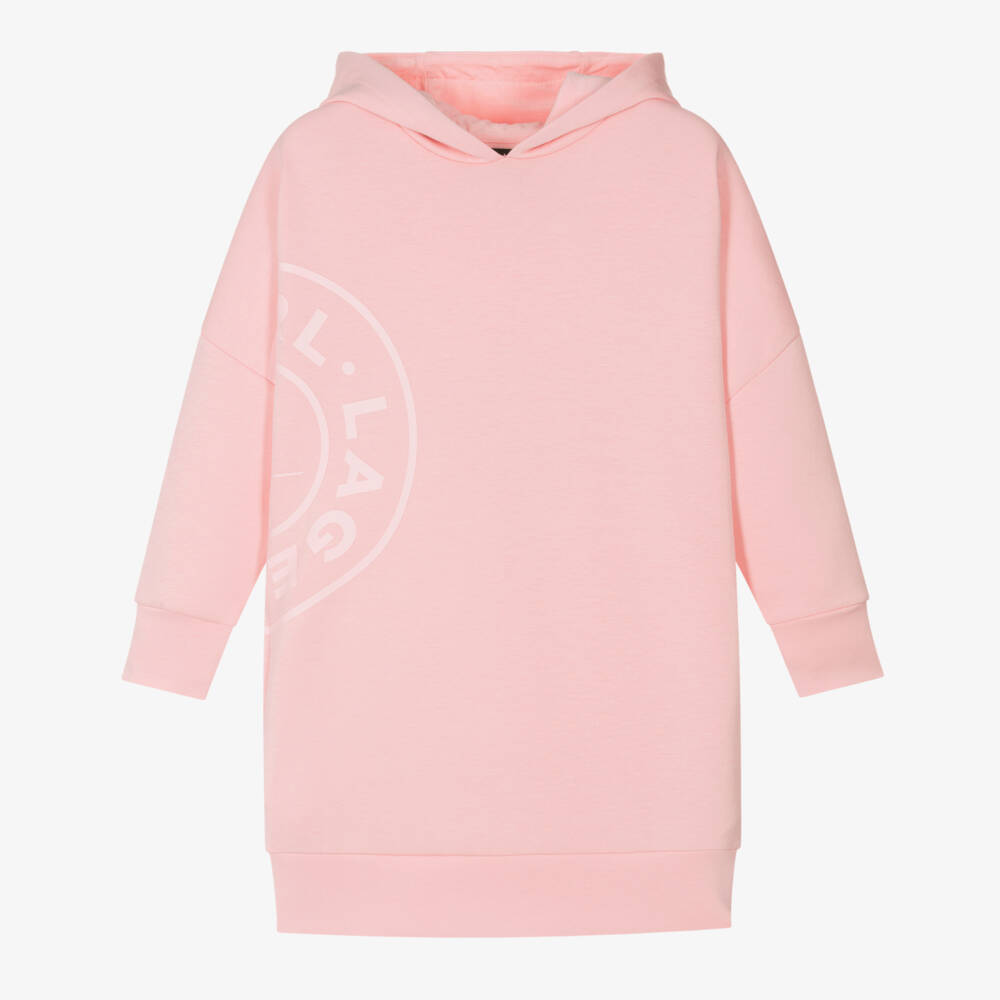 Pink cotton-blend hooded sweatshirt dress for girls by KARL LAGERFELD KIDS, made in a soft double jersey. Designed in a casual fit with dropped shoulders, this comfortable dress has a tonal circular logo design on both the front and back. Useful side seam pockets complete this casual style.