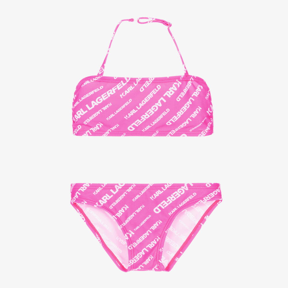 Bright pink bikini for girls by KARL LAGERFELD KIDS, patterned with white logos. The bandeau-style top has an adjustable halter neck. Silky smooth and stretchy, both are lined on the front side for extra comfort.