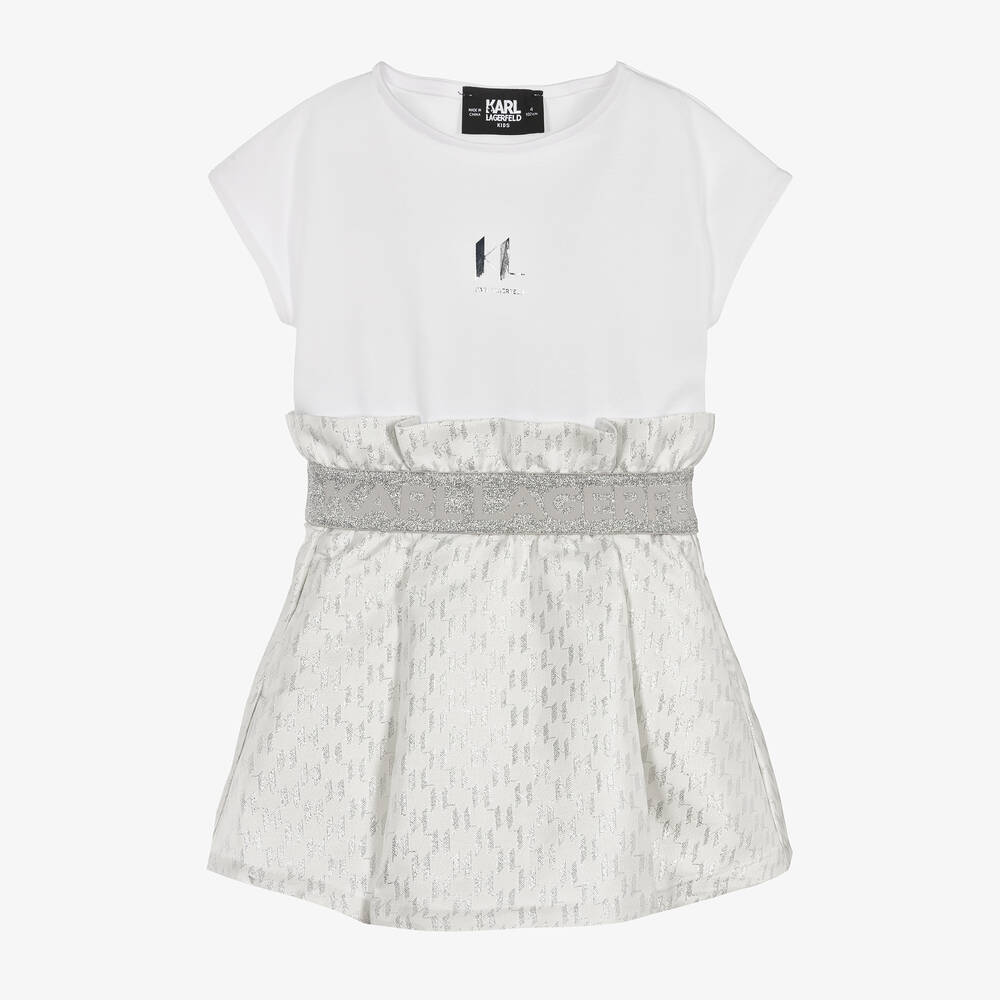 A short-sleeved dress for girls by KARL LAGERFELD KIDS, in white and silver. The designer's mirror-effect logo is printed on the cotton bodice and sparkling KL Monogram branding is woven within the soft jacquard fabric of the skirt. This statement look features a paper-bag waist, elasticated for comfort and signed with bold glitter logos. The style is complete with convenient side pockets and a comfortable viscose lining.