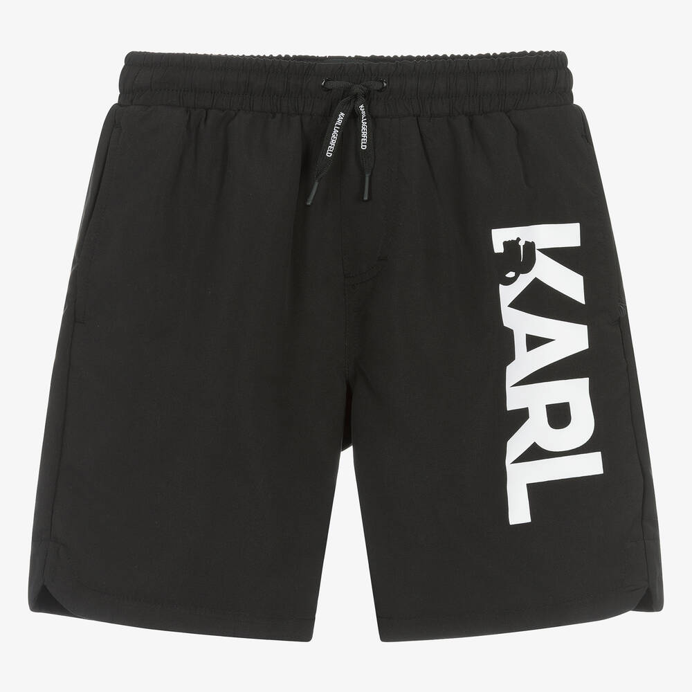 Mini-me black swim shorts for teen boys from KARL LAGERFELD KIDS, with a bold white KARL logo print on one side. They have an elasticated waistband secured with a branded black drawstring and a black logo patch around the back. Smooth with a soft mesh lining for comfort, these board shorts have side seam pockets, a back pocket and eyelets.