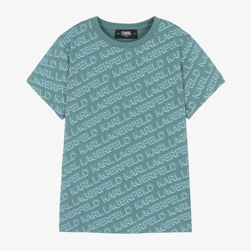 Unmistakably by KARL LAGERFELD KIDS, a blue T-shirt for teen boys with an eye-catching all over logo pattern, edged in pale blue. As seen in the main collection, this easy-to-wear casual top has a ribbed crew neck and is made in soft and comfortable organic cotton jersey.