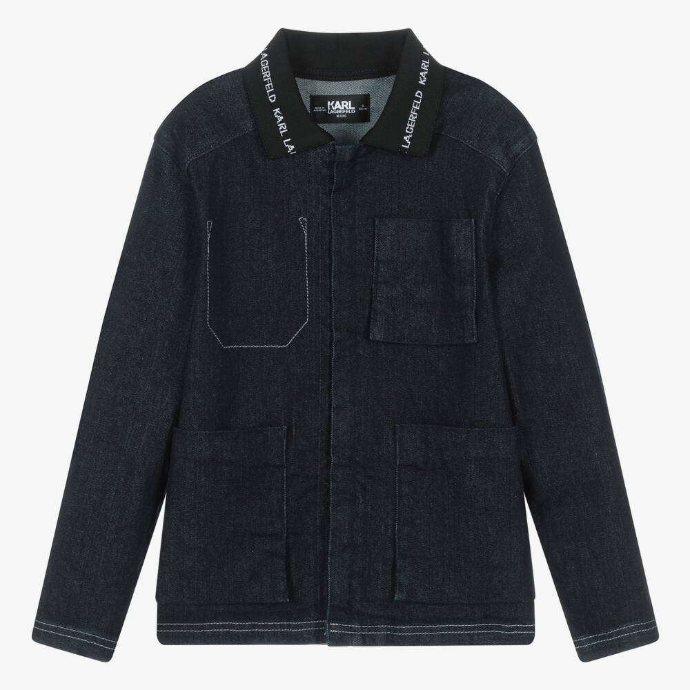 A zip-up jacket for teen boys by KARL LAGERFELD KIDS, in a dark blue denim wash. A cool shacket style, it has a ribbed black and white jacquard logo collar, three patch pockets on the front, and a stitched illusion pocket for a unique look. This comfortable, stretchy, smart-casual jacket is made in cotton with a logo-branded zip pull for an added designer touch.