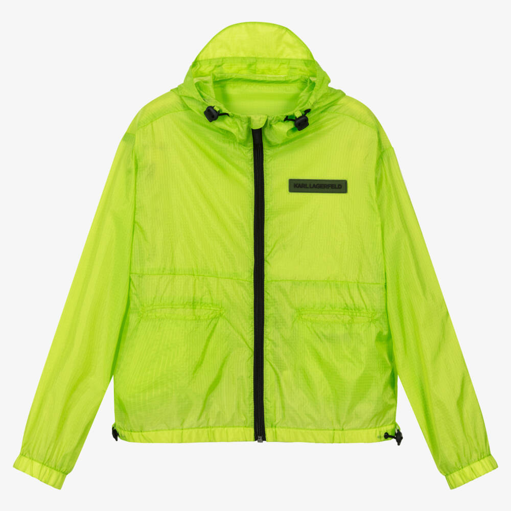 Bright lime green hooded windbreaker jacket for teen boys by KARL LAGERFELD KIDS, with a black rubber logo on the front. It has a bold black logo on the back, a black zip fastening on the front, and black toggles on the hood and hem. There are front pockets and a useful peak on the hood. Super lightweight, it is made in silky nylon ripstop and is ideal for layering and sports activities.