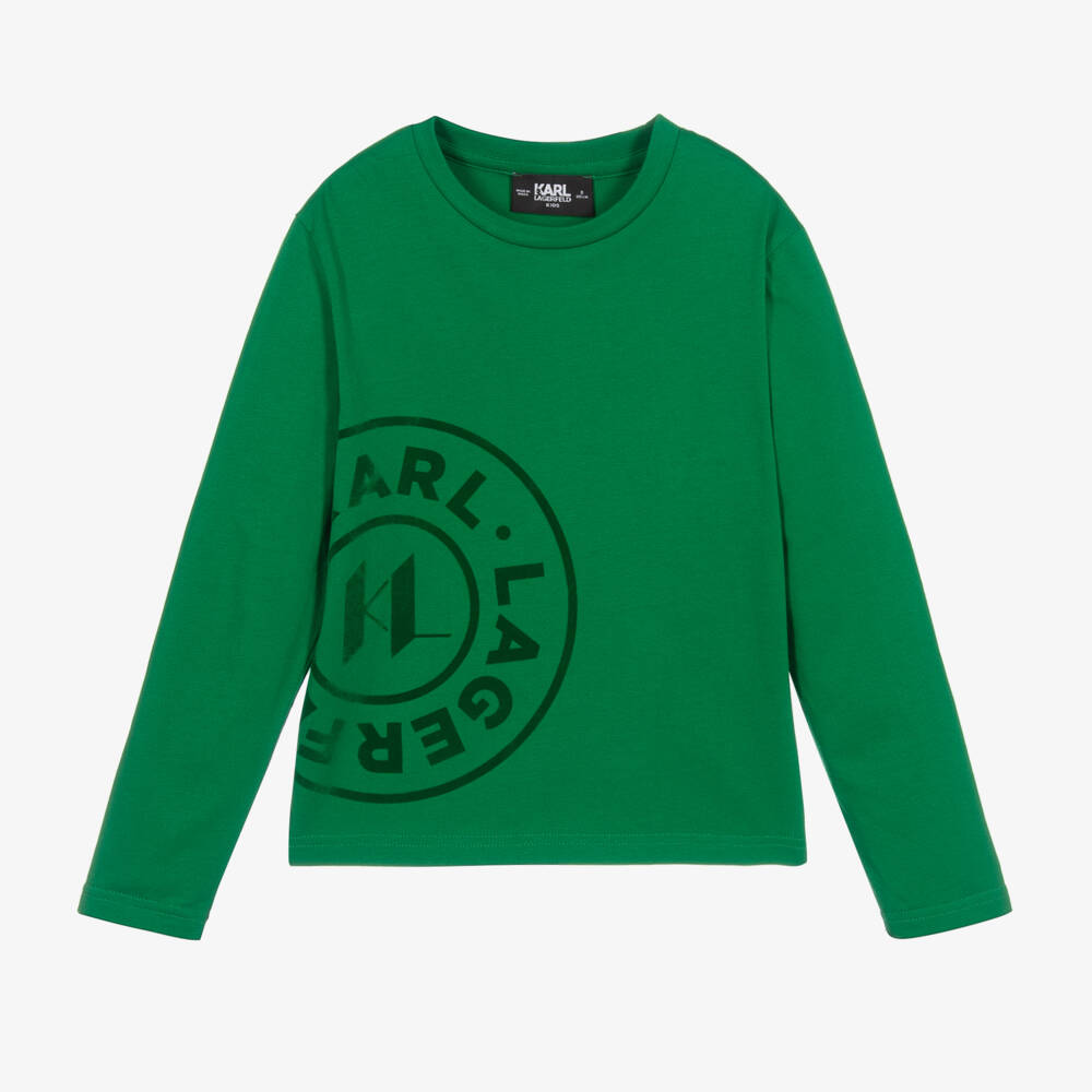 Cool and casual, this long-sleeved green top for teen boys is by KARL LAGERFELD KIDS. It has a large circular badge logo flocked on the front for an eye-catching effect. Soft and comfortable, it is made in cotton jersey with a small logo branded on the back of one shoulder.