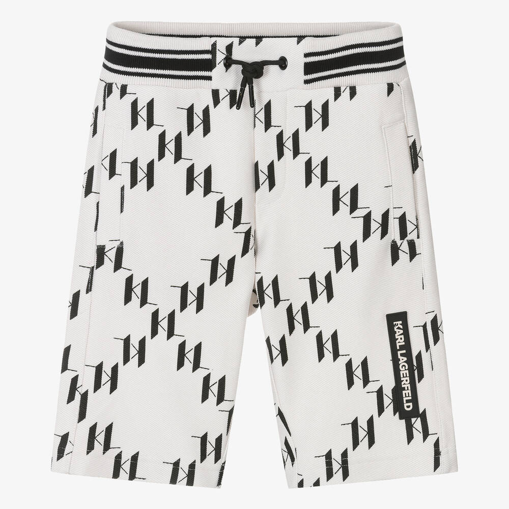 For cool, urban styling these ivory Bermuda shorts for teen boys by KARL LAGERFELD KIDS are patterned with the brand's KL monogram logo in black. Easy to wear, they are made in a soft ribbed knit jersey and have a comfortable, drawstring waistband, with black stripe detailing. Pockets on the front and a rubberised logo patch on one leg add a casual, yet stylish finish.