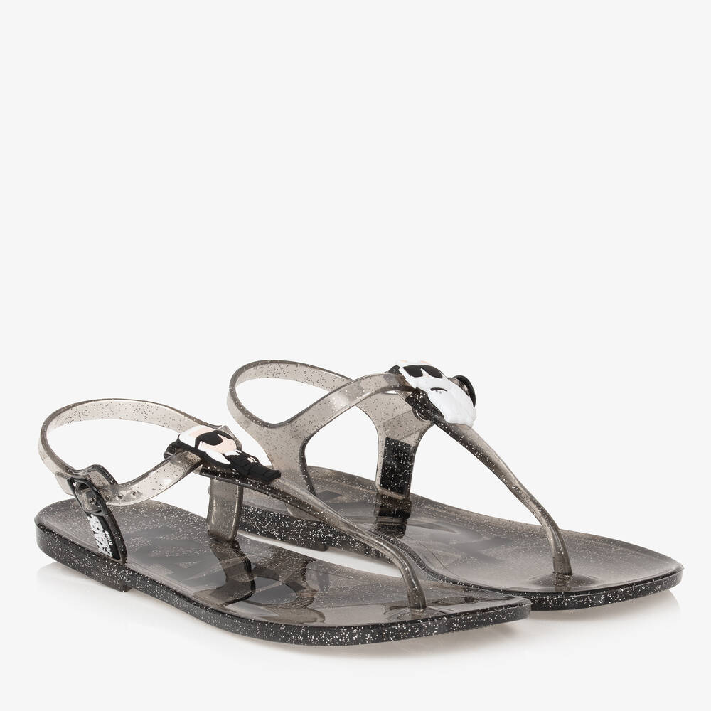 These black jelly sandals for teen girls from KARL LAGERFELD KIDS sparkle with silver glitter. The German fashion label has styled these cool jelly shoes with Karl Ikonik and Choupette the cat motifs attached to the toe posts for that unmistakable designer look. Further branding includes logo details on the straps and sleek black print on the inner soles. Great for casual or beachwear, they are made in smooth, rubberised material and fasten with adjustable buckles around the ankles.