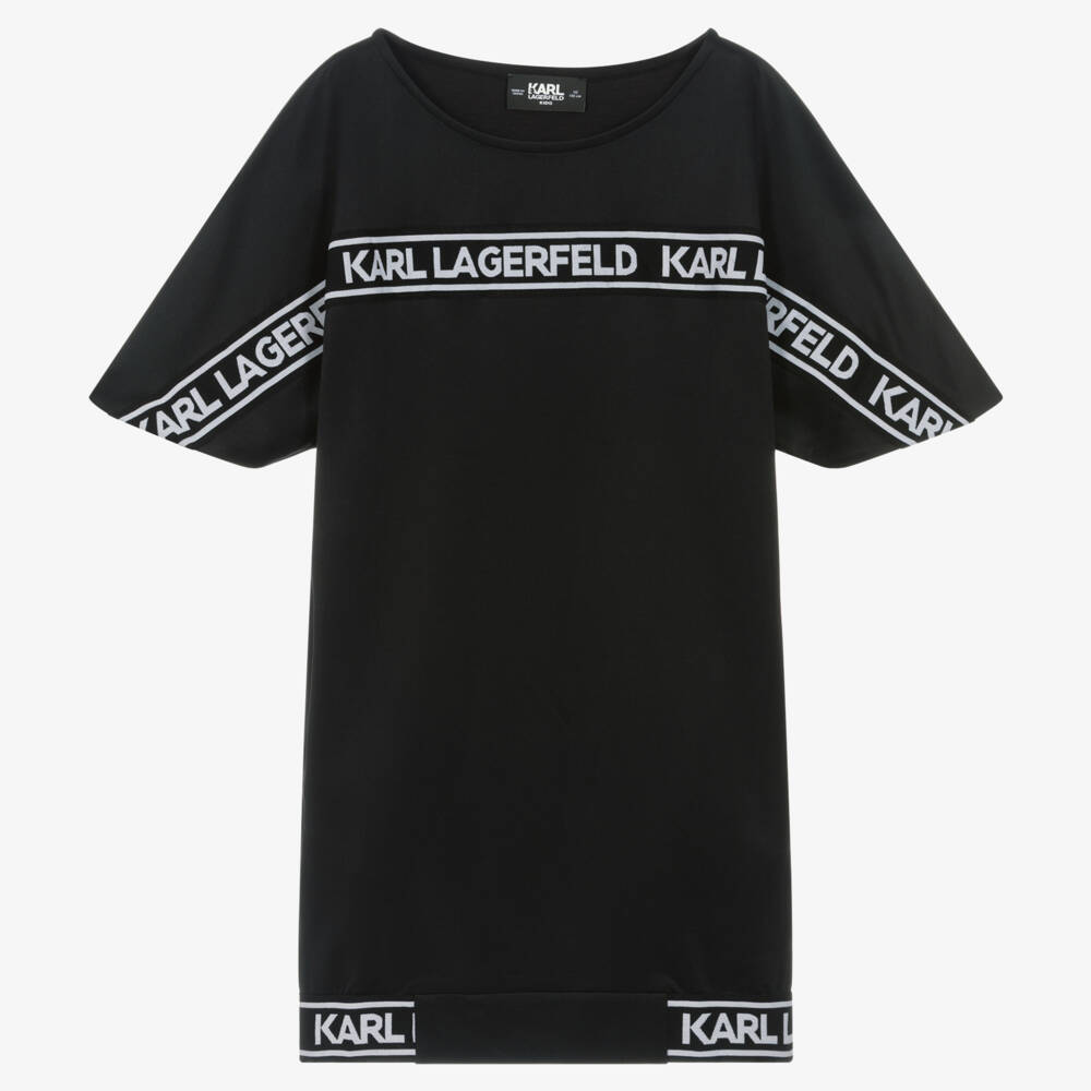 Casual black dress for teen girls by KARL LAGERFELD KIDS, with monochrome logo tape trims across the front and around the hem. Edgy and bold, it has a relaxed fitting batwing style, giving it a gentle sweatshirt look. With useful pockets on the side seams, it is made in super soft and silky double jersey for optimum comfort.