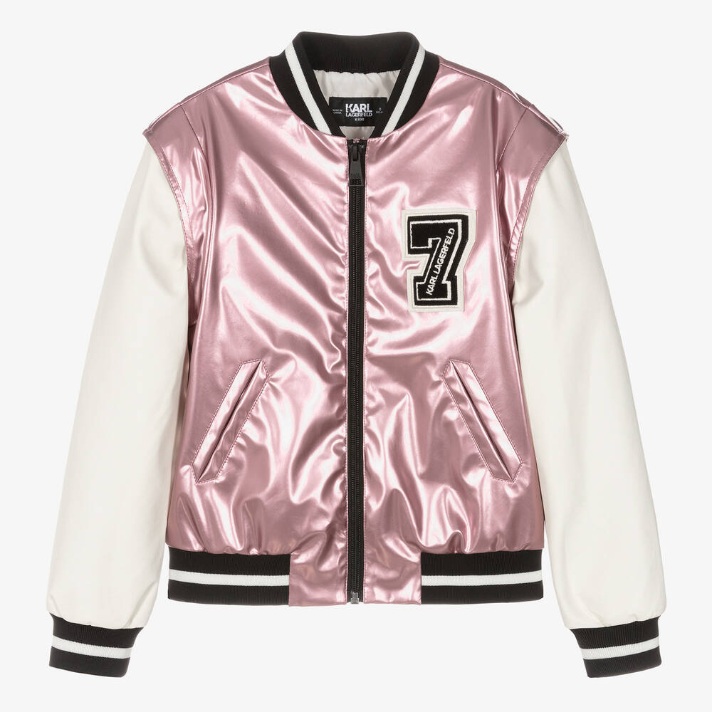 Super cool for teen girls, a metallic pink and ivory zip-up bomber jacket by KARL LAGERFELD KIDS. It has a '7' logo patch in bouclé appliqué on the chest and an embroidered black Karl Signature logo across the back. To complete the contemporary varsity look, there are ribbed black and white striped trims. The body is smooth and shiny, while the ivory sleeves are made in soft faux leather. It is fully lined in logo jacquard satin for comfort and has two pockets on the front.