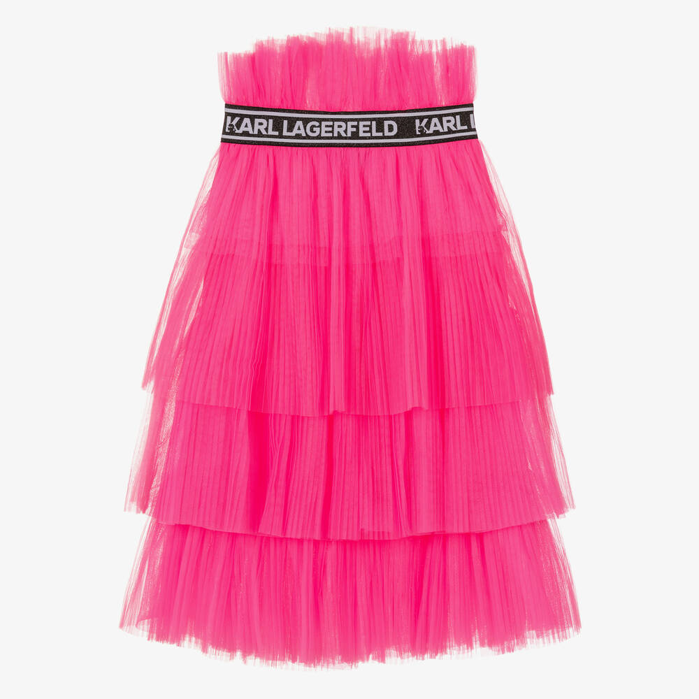 Stand-out midi skirt for teen girls by KARL LAGERFELD KIDS, in a striking neon pink colourway. Ideal for a party or special occasion, this impressive skirt is made using layers of pleated tulle to give a tutu feel with a luxurious, elevated feel. A sparkling jacquard logo waistband adds a branded, contemporary twist. It is lined in softly woven viscose for uncompromised comfort.