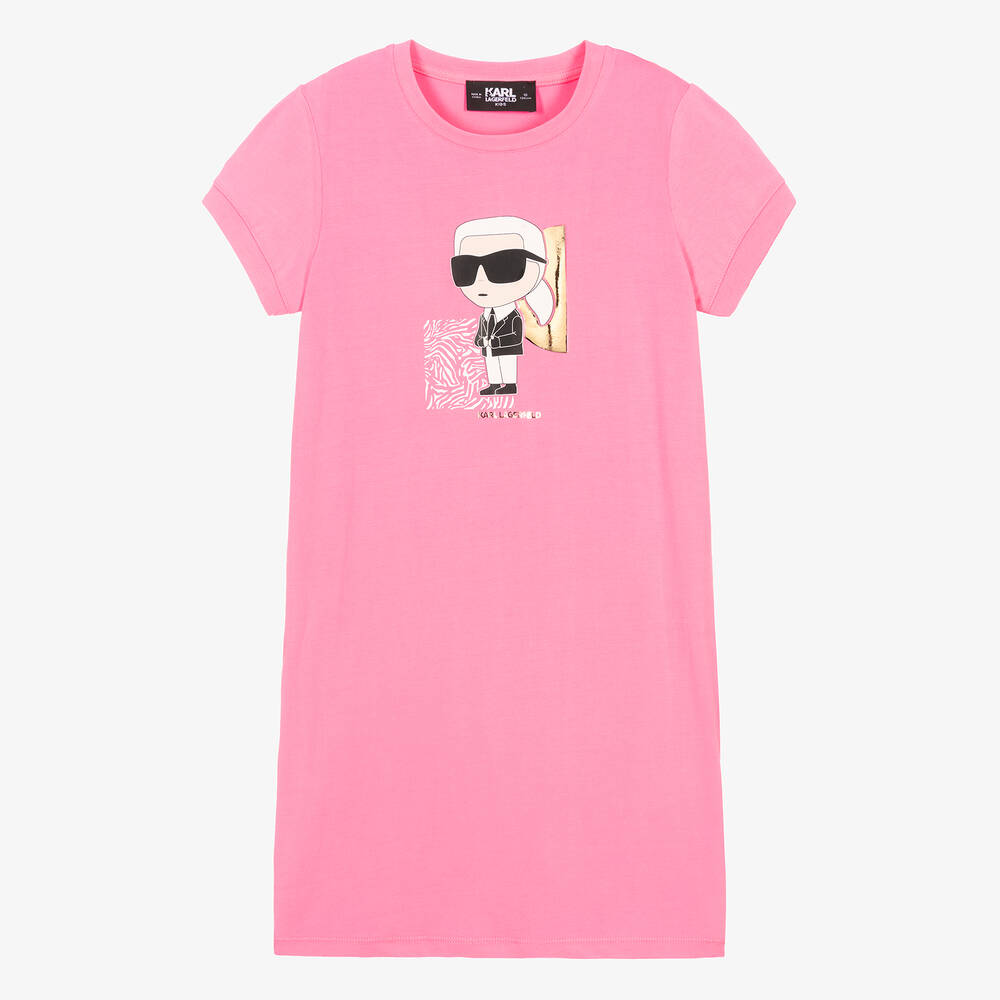 A neon pink T-shirt dress for teen girls by KARL LAGERFELD KIDS, with a Karl Ikonik logo and zebra print on the front. Pulled on over the head, this casual style is designed with a lightly ribbed neckline and cuffs. It is made from soft and stretchy cotton jersey which makes it comfortable to wear on laid-back days.