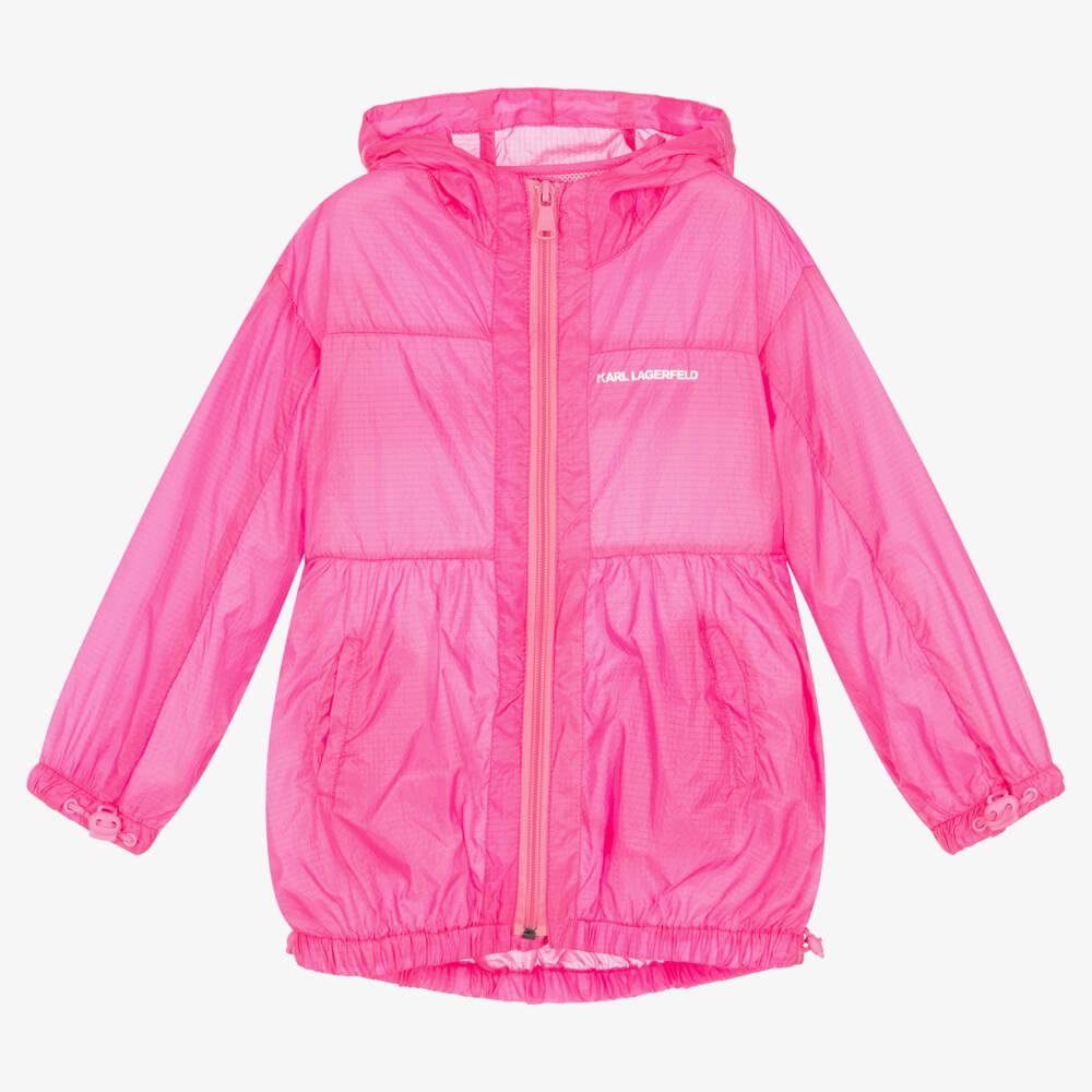 Lightweight pink windbreaker coat for teen girls by KARL LAGERFELD KIDS. It has matching white logo prints on the front and back, a fixed hood, and toggle adjustable elasticated trims to keep out the rain. Gathered from the waist down, it is slightly longer around the back and has useful front pockets, and fastens with an exposed zip.