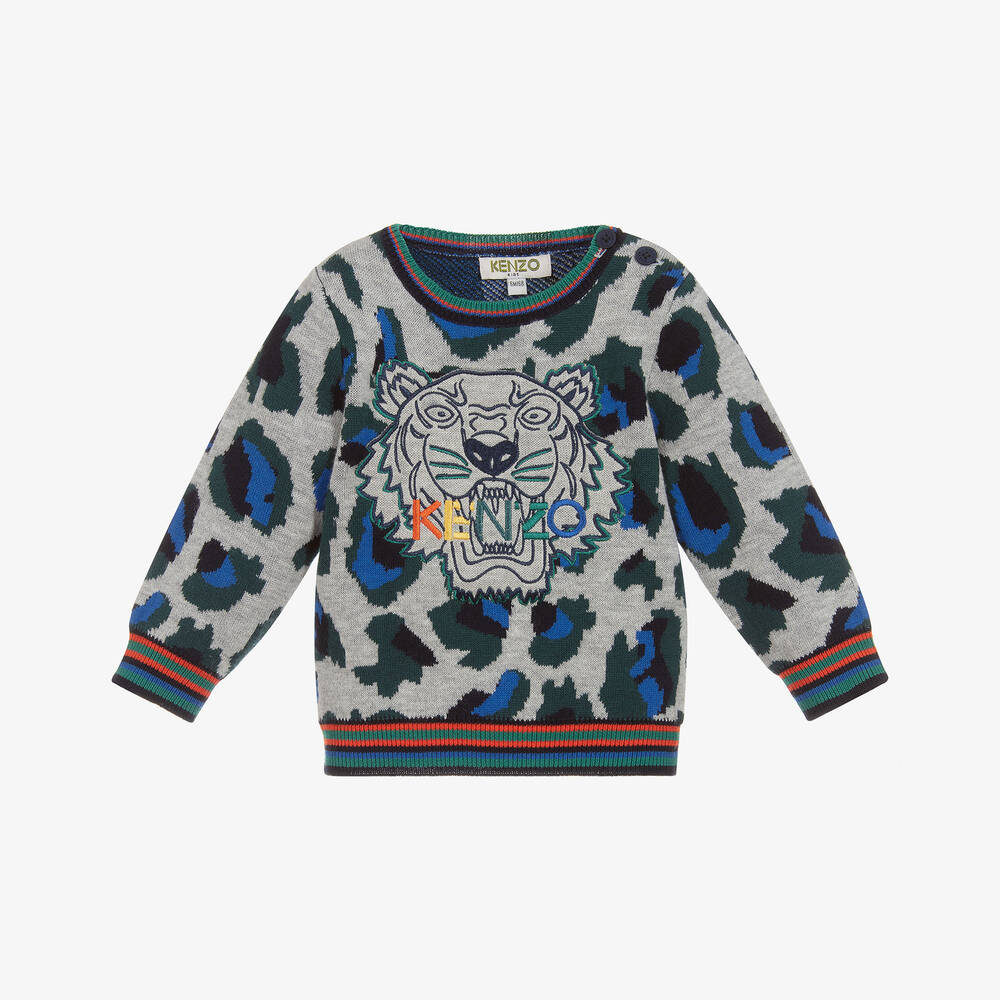 Baby boys grey sweater with green and blue 'Panther' print and Iconic Tiger embroidery, by Kenzo Kids. Knitted in a double layer of cotton and viscose, with a touch of wool, it is soft and warm.