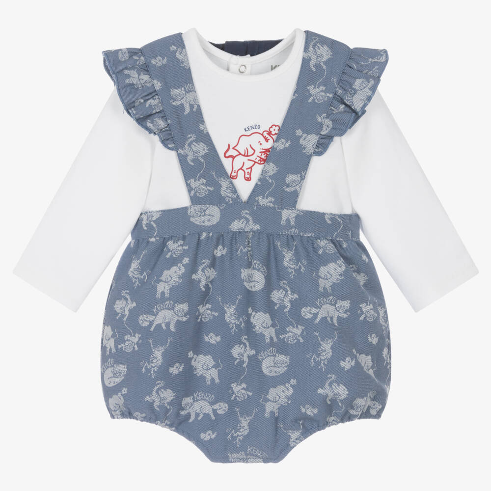 Sweet ivory and blue denim shorts set for baby girls by luxury French brand KENZO KIDS. Made in soft, comfortable cotton, the top has the brand's adorable baby Elephant printed on the front in red, with the brand's blue logo above and fastens with poppers around the back. The soft, jacquard denim shorts are patterned with baby animals and logos, and have pretty ruffles over the shoulders. They have a full shape, with a lightweight cotton voile lining and gently elasticated cuffs. They fasten on the back panel with a neat, concealed zip and poppers between the legs.
