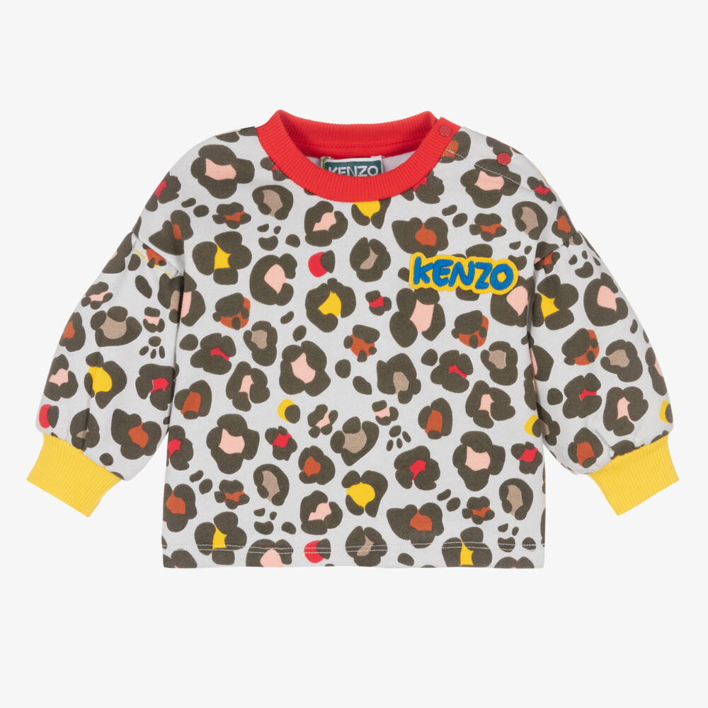 Cute light grey sweatshirt for baby girls by KENZO KIDS, made in soft, mid-weight cotton jersey. Patterned with a khaki green, pink and yellow animal print, it has a warm and cosy fleecy inside. It has bright red and yellow ribbed trims and useful popper fastenings on one shoulder to help with dressing. There is a blue and yellow embroidered logo patch on the chest for a colourful designer finish.