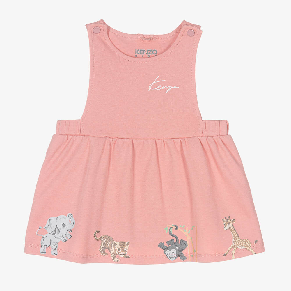 A sweet pink pinafore dress for baby girls by KENZO KIDS, made in soft and stretchy cotton jersey. Designed with integrated knickers, the dress has a white logo print on the chest, and the gathered skirt has cute jungle animal motifs on the hem. There are popper fastenings on the shoulders and between the legs to help with daily changing. This garment contains cotton from organic farming.