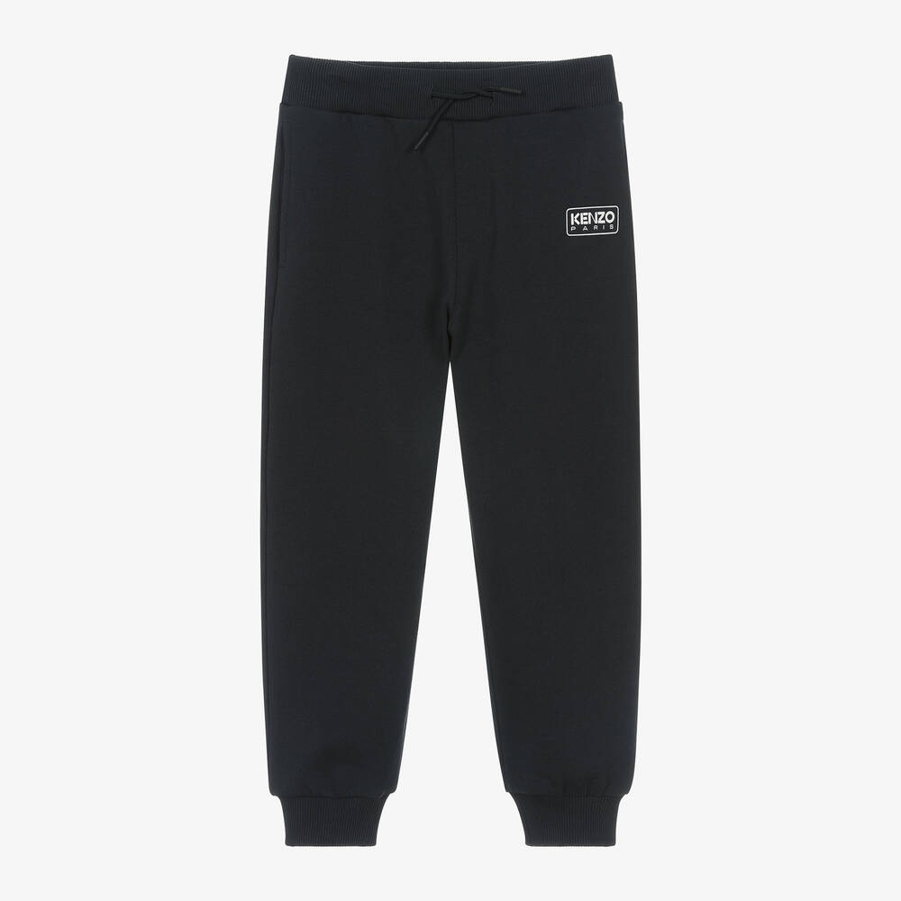 Black joggers for boys and girls by KENZO KIDS, made in comfortable organic cotton jersey with a soft, fleecy feel inside. Ideal for everyday casual wear, these cuffed joggers have useful side seam pockets, a patch pocket on the back and a drawstring elasticated waistband for a great fit. Adding a signature touch, the brand's iconic Paris logo can be seen on the front in white.