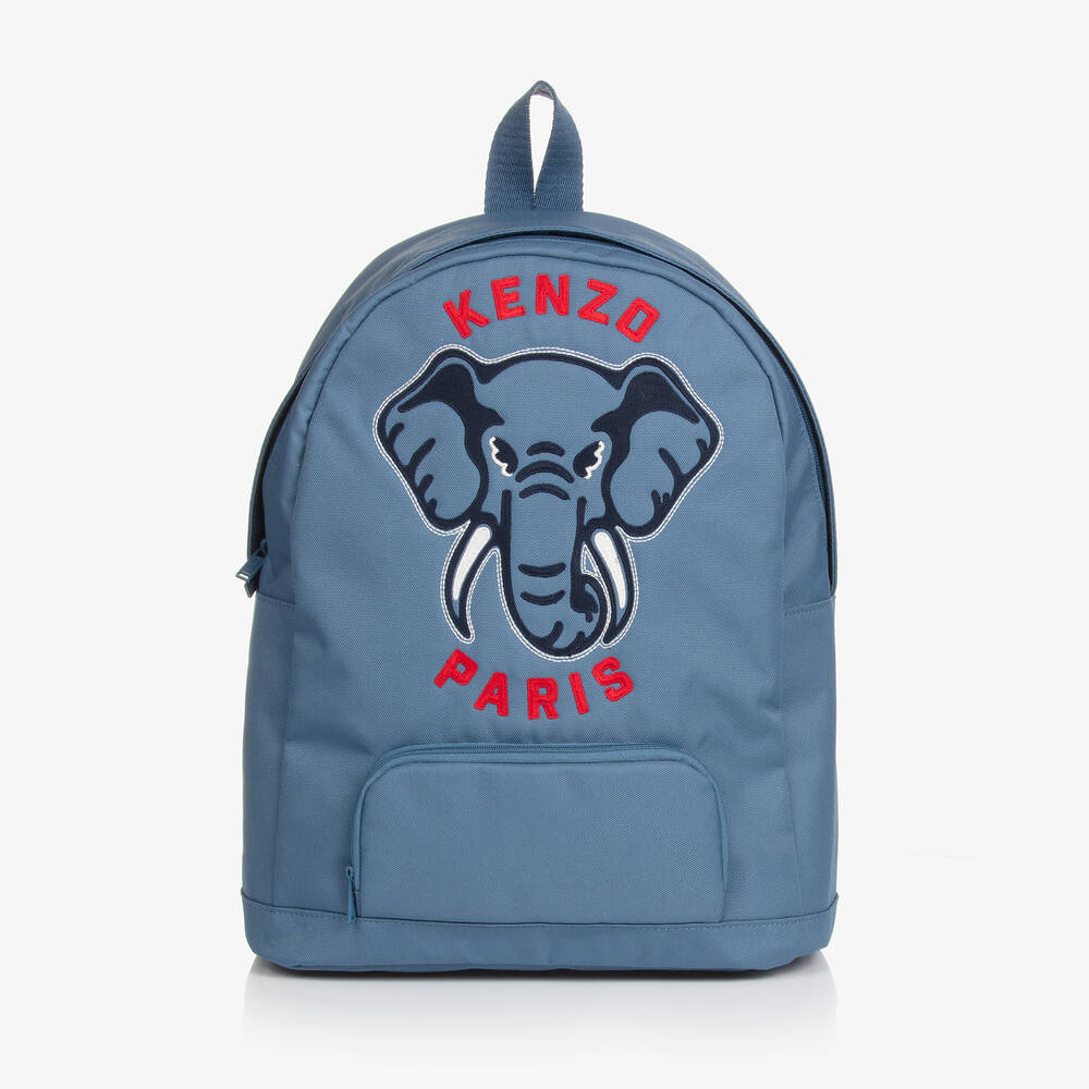 Blue backpack for boys and girls by KENZO KIDS, made in smooth canvas twill. The spacious main compartment has an internal pocket and fastens with a zip. The front features the brand's iconic Elephant in blue with a red embroidered logo for a stand-out designer statement. There is a small external zipped pocket on the front and a useful carry handle. The back and adjustable shoulder straps are padded for comfort and the straps have tonal logo embroidery for a subtle branded finish.