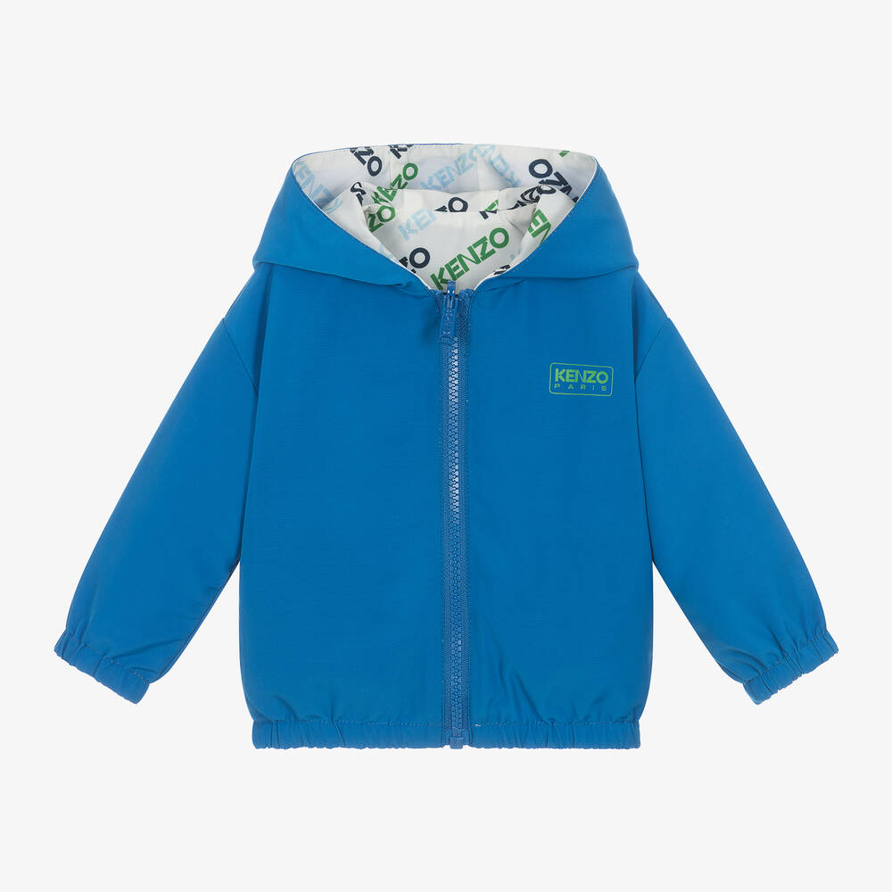 A reversible, bright blue hooded windbreaker jacket for younger boys and girls by French brand KENZO KIDS. A large green Kenzo Paris motif is printed on the back, with a smaller matching logo on the front. The logo-inspired reverse side is patterned with signature prints in shades of blue and green. Made in a silky smooth fabric, it has elasticated cuffs and hem for a snug fit, with concealed side seam pockets and a branded zip fastening.