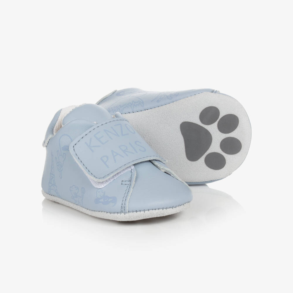 Light blue pre-walker shoes for baby boys and girls by KENZO KIDS, made from soft and supple leather. These comfortable shoes have a velcro strap fastening with a Kenzo Paris logo print on the front. They are designed with an all-over Mini Iconics animal print for both an adorable and distinguished look. They have a soft mesh lining and a flexible suede outsole for comfort with every step.