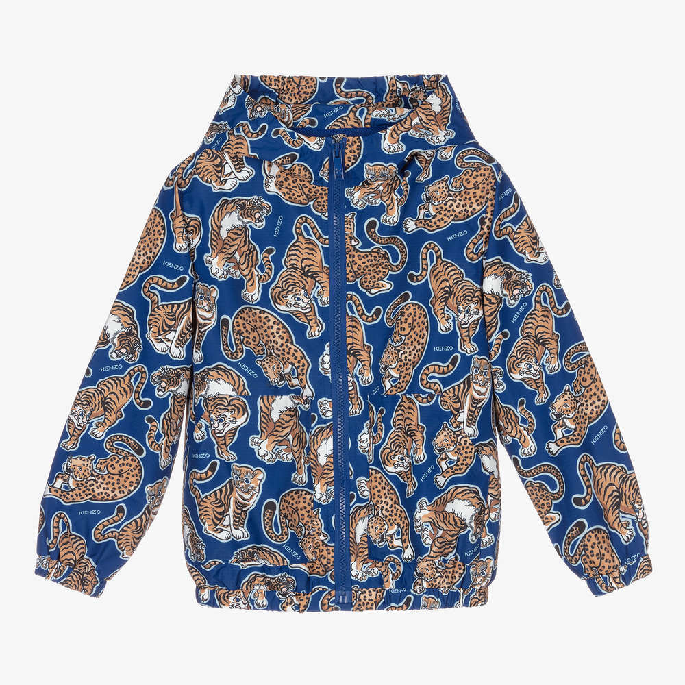 Boys bright blue hooded windbreaker jacket by KENZO KIDS, with brown Pop Tigers and white logo print all-over. Made in a smooth, lightweight nylon ripstop, it has a soft mesh lining. With a practical zip-up front, it has hand pockets on the front and elasticated cuffs and hem.