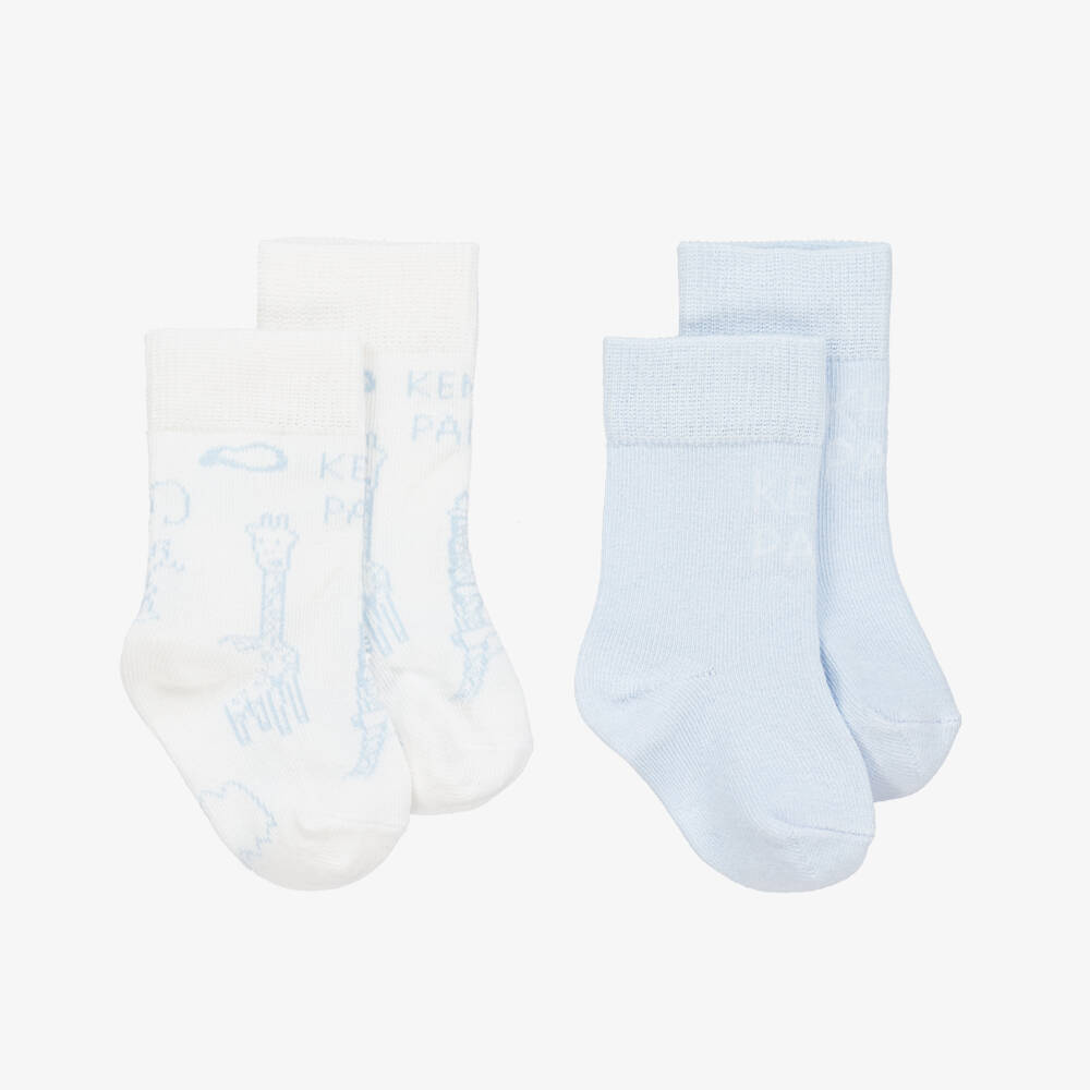 Two pairs of blue and white socks for baby boys and girls from KENZO KIDS, knitted in a super soft cotton blend. The white pair has pale blue jacquard logos. The blue pair is patterned with cute Mini-iconics jacquard graphics and logos.
