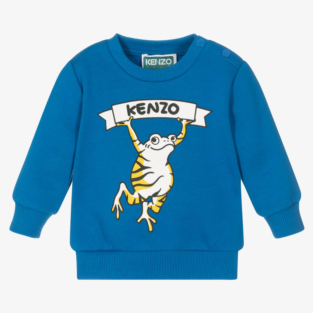Vibrant cobalt blue cotton-rich sweatshirt for little boys by KENZO KIDS. On both the front and back is a stand-out print of the label's cute Frog character holding a logo banner, in yellow, white and black. Ribbed trims, logo shoulder poppers and a fleecy-feel underside ensure this soft jersey top is cosy, comfortable and easy to wear.