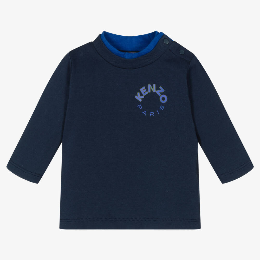 Navy blue long-sleeved top for little boys from KENZO KIDS. This essential layering piece is made in comfortable cotton jersey with popper fastenings on one shoulder to help with dressing. For a distinctive designer touch, it has contrast bright blue Kenzo Paris logo prints on the front and back and a layered ribbed crew neck with matching trim.
